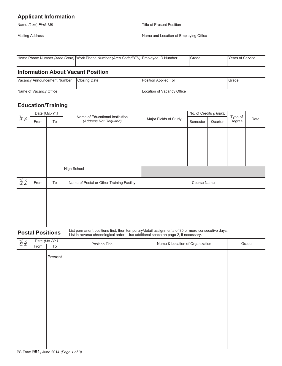 The form was revised on June 1, 2014 . An up-to-date PS Form 991 fillable version is available for download below. The form should be sent to the office that announced the job opening at the address indicated in the vacancy description.